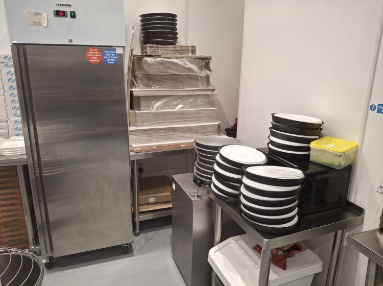 Prep Area 205 sq.ft. (19 sq.m) with sinks, pizza conveyor machine, chilled topping counter, fridges, washing machine.